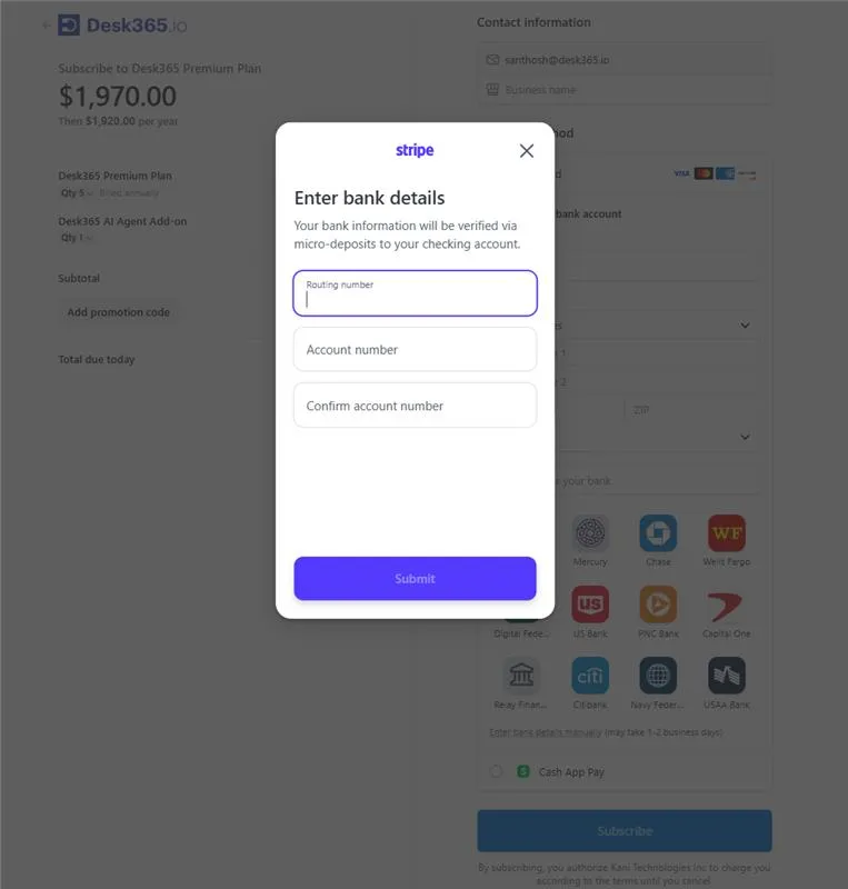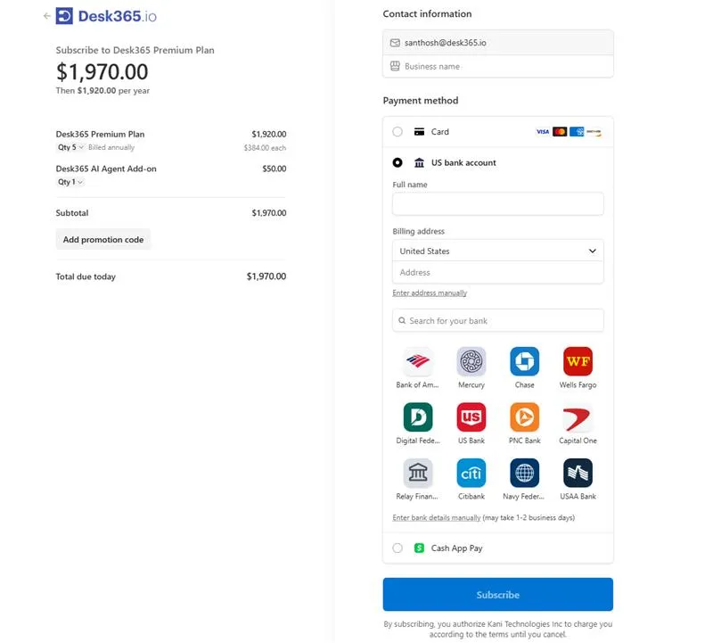 To subscribe to the Desk365 Premium Plan, start by selecting “US Bank Account” as your preferred payment method. Next, you’ll need to finalize your payment by filling in the required details, including your bank account information. You have the option to search for your bank from the list of available institutions or manually enter your bank details if your bank is not listed.
