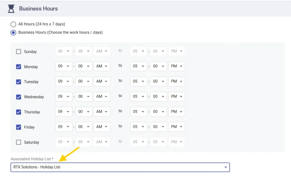 While creating or editing business hours, select the appropriate holiday list from the dropdown menu and save the configuration.