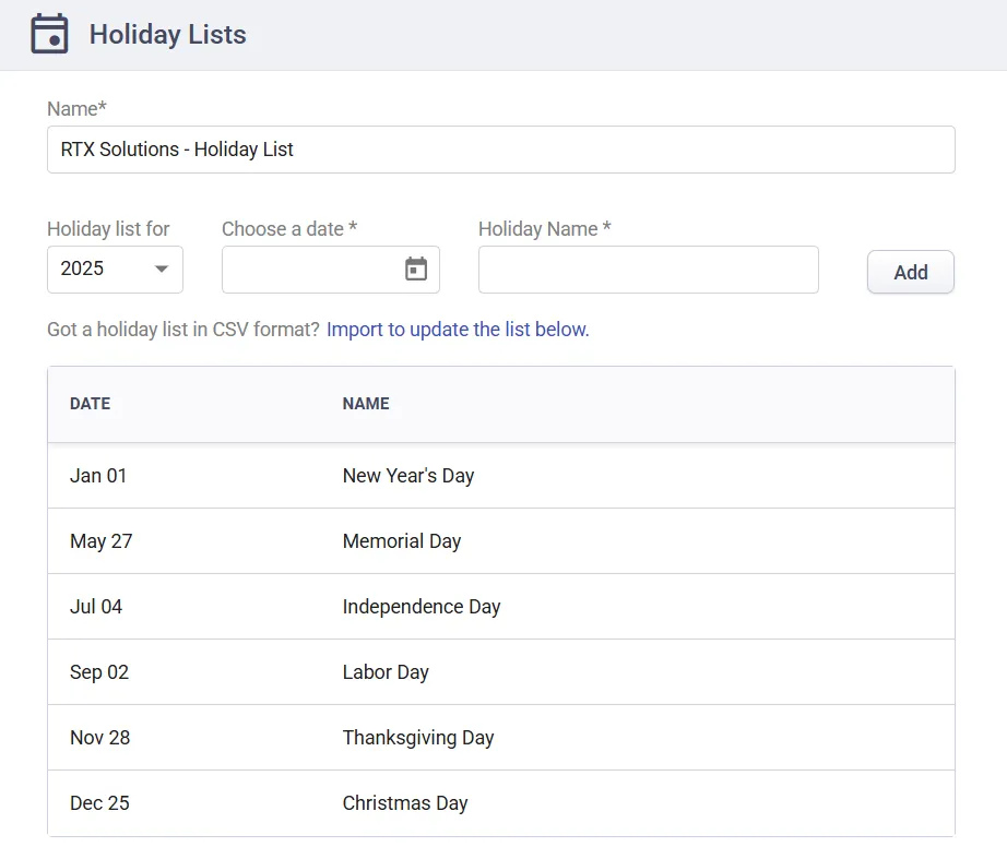 - Import holiday lists easily using a CSV file to streamline the setup process.