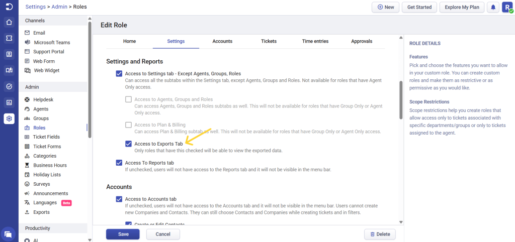 Additionally, within Settings > Admin > Roles > Settings and Reports, you can manage access to the Exports tab. Only roles that have this option checked will be able to access the Exports tab. This makes it easy to monitor export activity, ensure data security, and track what’s being shared across your helpdesk.